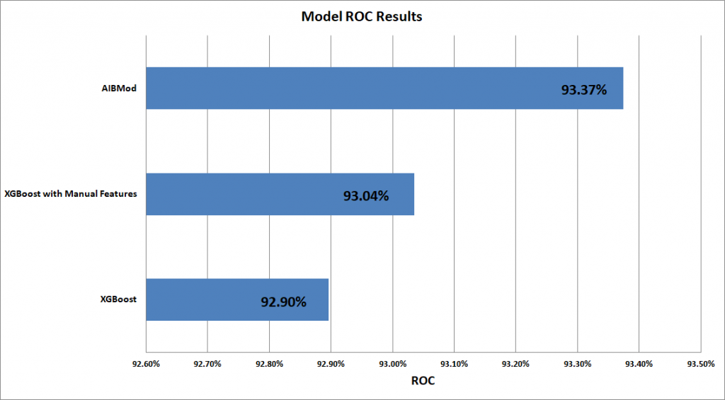 It also shows that even with an additional 27 manually created features, the XGBoost model is unable to beat the AIBMod model results.