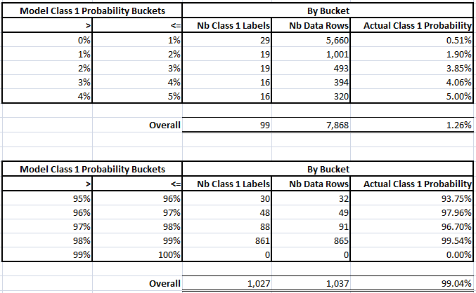 Another observation is that the model did not predict anything in the 99% to 100% bucket – in fact looking at the prediction probabilities the maximum value for Class 1 probability was 98.677%.
