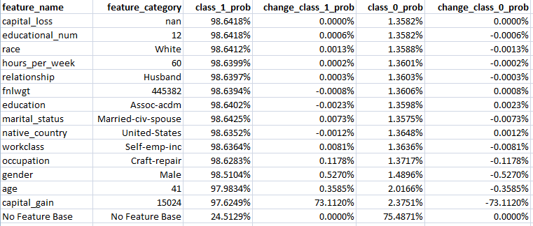 Looking down the table shows the impact to the class 1 probability of removing the feature indicated in the first two columns.