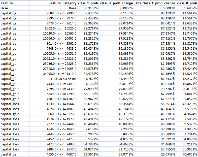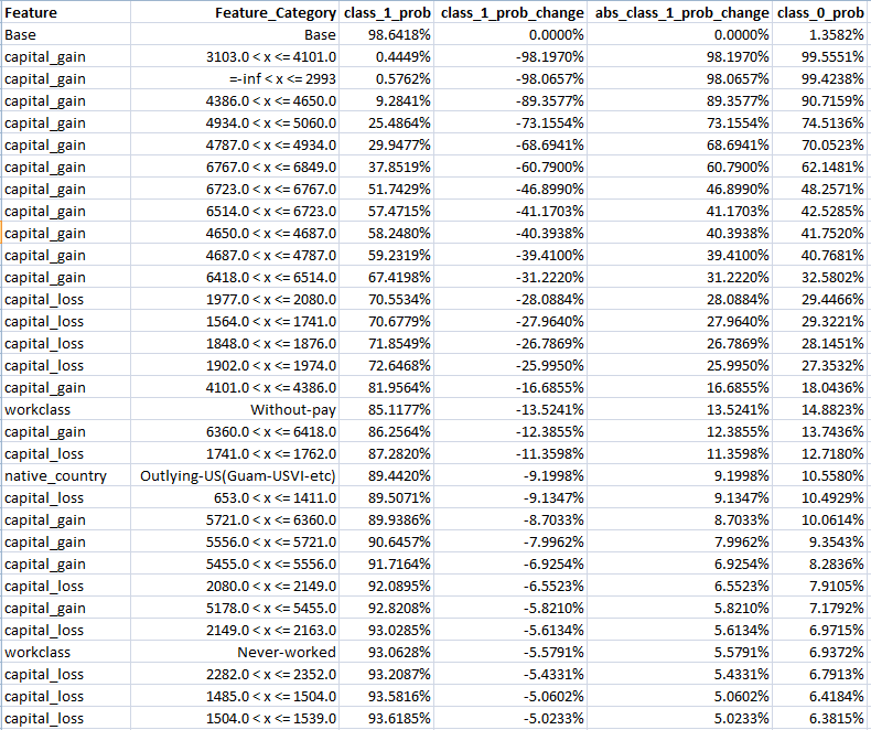 The penultimate row shows that if all one knows about the individual is that their capital_gain is ‘15024’, or $15,024, the probability of being in class 1 moved from the base of 24.5129% to 97.6249%.