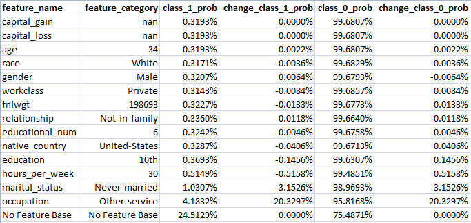 The top row shows the overall prediction – namely the probability of this individual earning over $50,000 per annum (Class 1) – of 0.3193%.