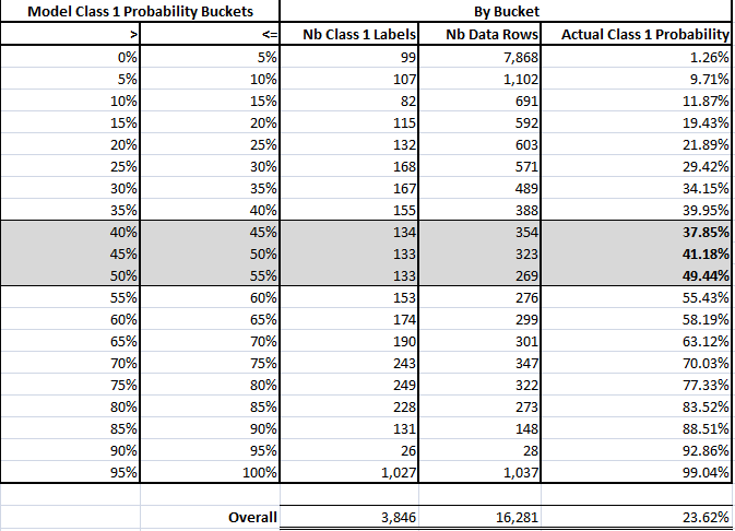 AIBMod realised that if the test model probabilities were sorted into 5% buckets the proportion of the Class 1 labels within those buckets should, broadly speaking, fit within the bucket boundaries.